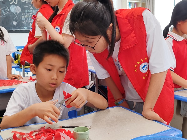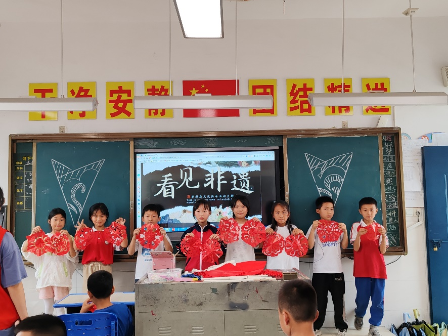 活动中,志愿者为中心小学的学生详细讲解着中国剪纸的历史、形式和图案内涵,并现场展示了剪纸技艺。精美的剪纸引起了小朋友的兴趣,现场学习氛围浓厚。小朋友们在志愿者的指导示范下,由易到难,从折叠到剪裁,完成了窗花制作。