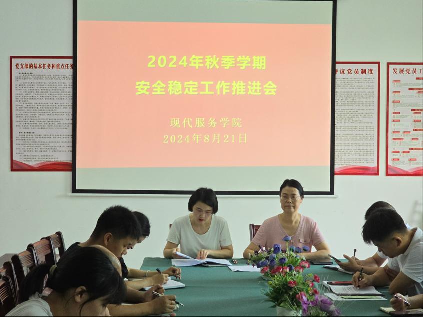 【现代服务学院徐卉报道】2024年8月21日,现代服务学院在党员活动室召开了2024年秋季学期安全稳定工作推进会。会议由分院党支部书记欧阳小缨主持,各教研室主任及管理人员参加。