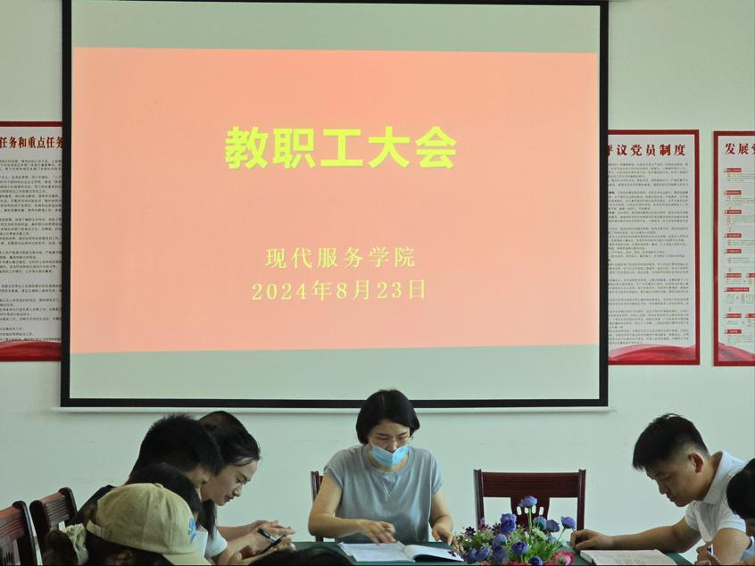 【现代服务学院徐卉报道】2024年8月23日,现代服务学院在党员活动室召开教职工大会。本次会议由分院副院长江敏主持,全体教师参加。