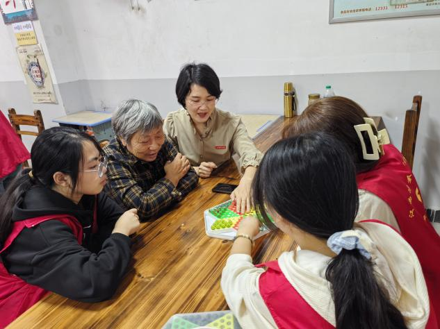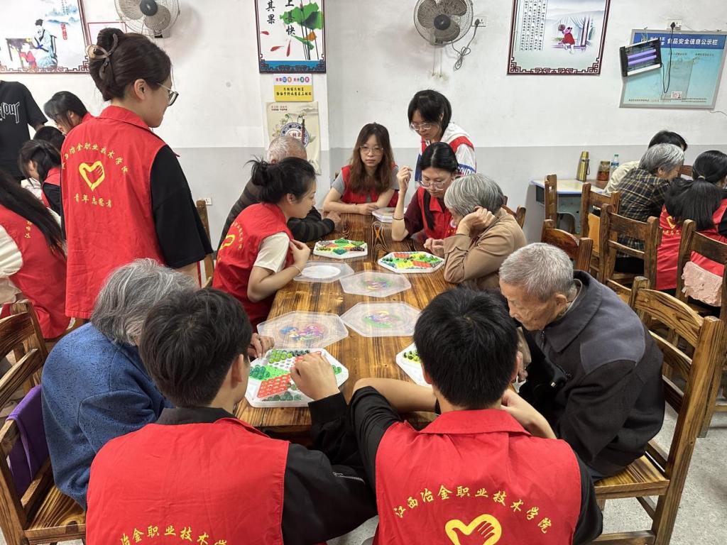 活动当天,志愿者们带着精心准备的礼物来到了养老院。老人们看到同学们的到来,脸上洋溢着幸福的笑容。在同学们的耐心陪伴下,老人们与同学们们围坐在一起,开始了跳棋游戏。一张张棋盘整齐排列,老年朋友们三五成群,或凝神思考,或欢声笑语,享受着跳棋带来的乐趣。他们有的经验丰富,棋艺高超,每一步都走得稳健有力;有的则是初学者,但在同学们的耐心指导下,也逐渐掌握了跳棋的基本规则和技巧。
