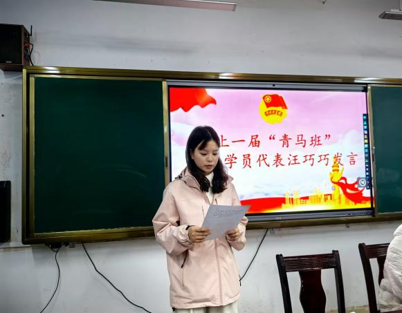 开班仪式在庄严的国歌声中正式拉开帷幕。全体青马班学员起立,齐唱国歌,现场气氛庄重而热烈。上届优秀学员代表汪巧巧同学上台发言。她回顾了自己的学习经历,分享了成长感悟,鼓励新学员们珍惜机会,努力提升思想政治素质和综合能力。于文杰同学代表本期青马班学员发言。他表达了对“青马工程”的憧憬和决心,承诺将以饱满的热情和认真的态度投入到学习中,不断提升自己的理论水平和实践能力。