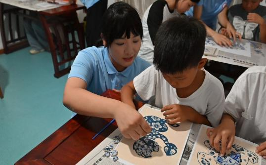 指导老师徐卉带来的示范作品,正是以景德镇典型的“青花山水图盖碗”为蓝本创作的贴画。“在景德镇看到匠人对着残片修复古瓷时,我就想,这些破碎的美不该只躺在博物馆里。”她指着贴画中交错的青白纹路,“现在,我们把这份匠心带到乡村,就是想让孩子们知道,文化传承不只是专家的事,每个普通人都能成为接力者。”从景德镇的实地研学,到乡村课堂的知识传递,实践队完成了一场跨越城乡的文化接力。