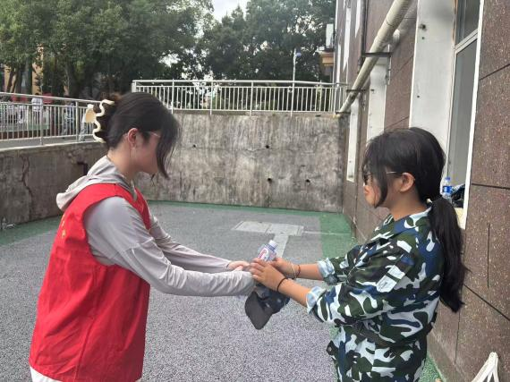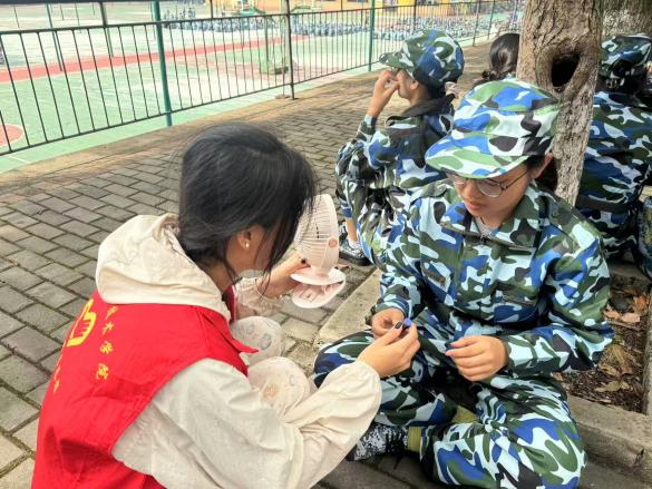 军训期间,高温天气给新生训练带来不小挑战。党员教师们每日定时到各军训方阵巡查,密切关注新生的身体状态与训练情绪,及时与教官沟通调整训练强度。当发现有新生出现头晕、乏力等中暑迹象时,志愿者们立即行动:有的迅速从服务点取来藿香正气水,仔细叮嘱服用方法;有的拿出随身携带的扇子,为中暑同学扇风降温;还有的一路小跑买来饮用水,缓解同学不适。对于症状较明显的同学,党员教师与志愿者搀扶着他们前往校医务室接受专业诊治,并全程陪同照料,确保得到及时妥善的处理。