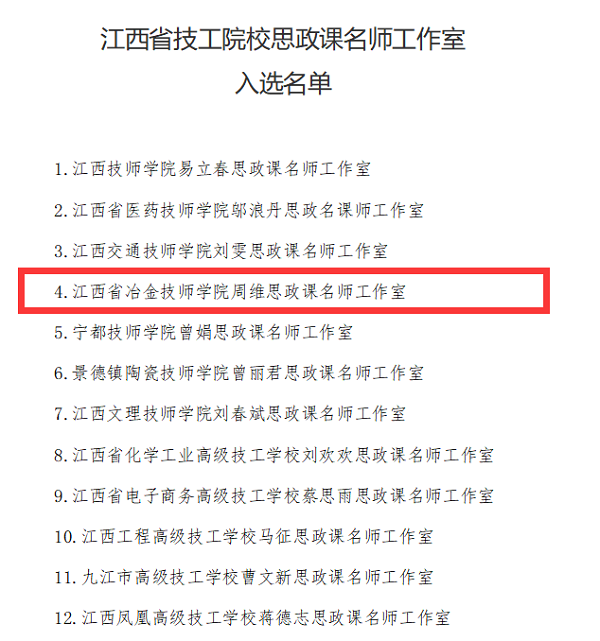 日前,江西省人力资源和社会保障厅公示《江西省技工院校思政课名师工作室入选名单》,学校思政部“周维思政课名师工作室”成功入选。