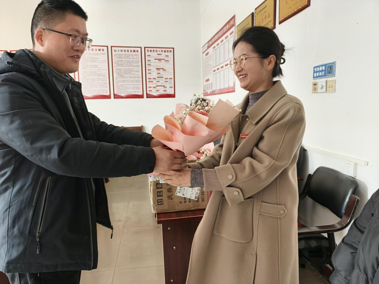 为庆祝“三八”国际劳动妇女节,工会思政部分会为女老师们预定了康乃馨花束,分会主席周维把花送到各位女老师手中。