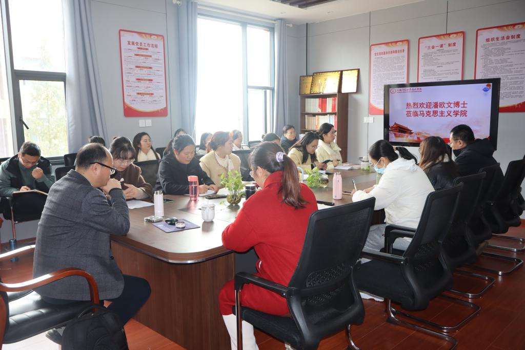 2025年11月18日下午,马克思主义学院特邀新余学院潘欧文教授来校讲学,围绕课程的教学创新与理论深化进行探讨。潘教授是国家民委第二届“中华民族共同体概论”课程教学展示活动普通高校组一等奖获得者。