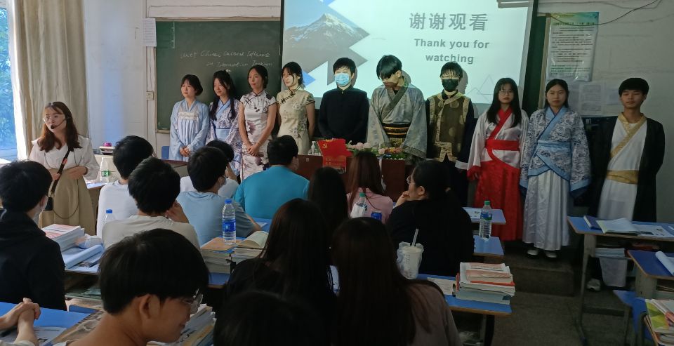 本次公开课的主题是中国文化对国际时尚的影响。在公开课上,兰艳老师首先采用问卷调查的方式了解学生对国潮风的认识和看法,问题既真实又有趣,在课堂上吸引了学生积极参与。兰艳老师还巧妙的设计课程内容的过渡,将学生的问卷调查分析结果以及中国国风品牌“盖娅传说”时装秀视频导入新课,视频效果良好,大家赞不绝口。整堂课教学内容充实,充分运用多种教学手段和信息技术,与学生形成良好互动,课堂气氛活跃,体现了兰艳老师深厚的专业知识和良好的课堂组织能力。在接下来的授课中,兰艳老师通过深入浅出地剖析课文,引导学生在读中学、思中悟,将“最强大脑九宫格”游戏法检测单词,激发出学生的好奇心和好胜心,课堂效果突出。授课中,兰艳老师深入挖掘本节课的课程思政元素,让学生自主探究,通过PPT分享、身着传统服饰等方式沉浸式地领略中国传统文化的精髓,探索中国传统文化瑰宝。从而教导学生树立文化自信,民族自信,传承和发展中国传统文化。