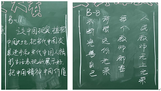 比赛现场,老师们精神饱满,一笔一画认真书写。不到10分钟,一幅幅富有个性的书法作品在黑板上呈现出来,有的清秀隽美,有的遒劲有力,有的稳重端庄,有的飘逸洒脱,一笔一划,一勾一折,无不体现着书写者的用心和才情。