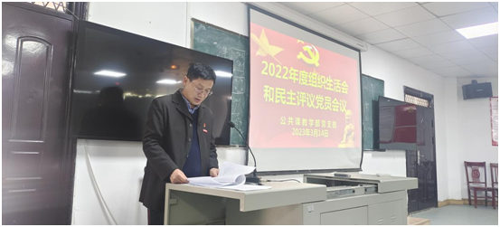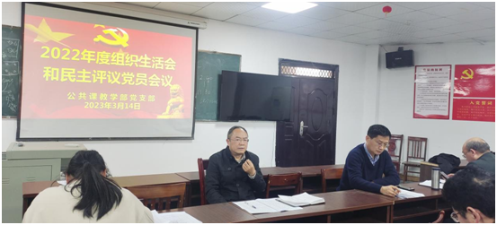【公共课教学部党支部雷小花报道】3月14日下午,公共课教学部党支部在明辨楼党员活动室312召开2022年度组织生活会和开展民主评议党员。会议由党支部书记戴宝富主持,学院党委委员、挂点支部领导彭全,组织部干部周慧玲老师作为督导组成员全程参加了会议。