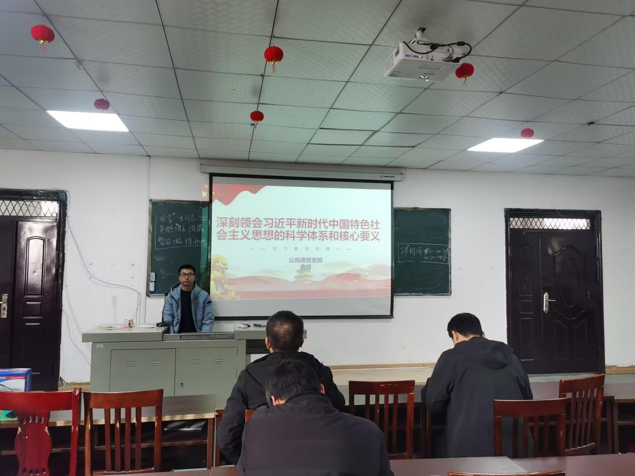【公共课教学部党支部雷小花报道】12月7日下午,公共课教学部党支部统战委员黄辉在明辨楼312为全体党员上了一堂主题为“深刻领会习近平新时代中国特色社会主义思想的科学体系和核心要义”的主题党课。支部书记陈耀新主持党课活动,公共课教学部全体党员参加学习。