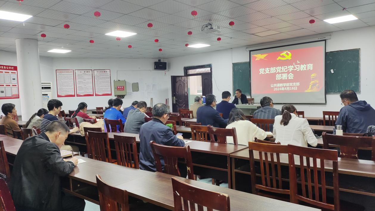 【公共课教学部党支部雷小花报道】4月16日下午,公共课教学部党支部在明辨楼312室开展党纪学习教育主题党日活动,召开党纪学习教育部署会。支部挂点校领导彭全出席,公共课教学部全体党员参加,党支部书记陈耀新主持会议。