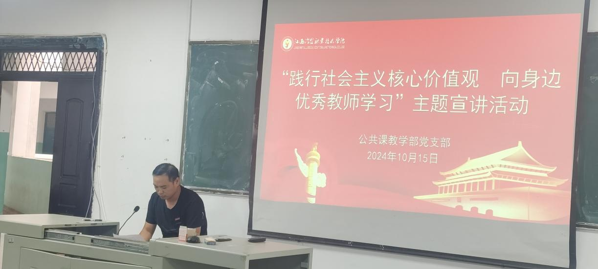 【公共课教学部党支部雷小花报道】10月15日下午,公共课教学部党支部在明辨楼312室举行“践行社会主义核心价值观 向身边优秀教师学习”主题宣讲活动。党支部书记陈耀新主持活动,公共课教学部全体教师参加学习。