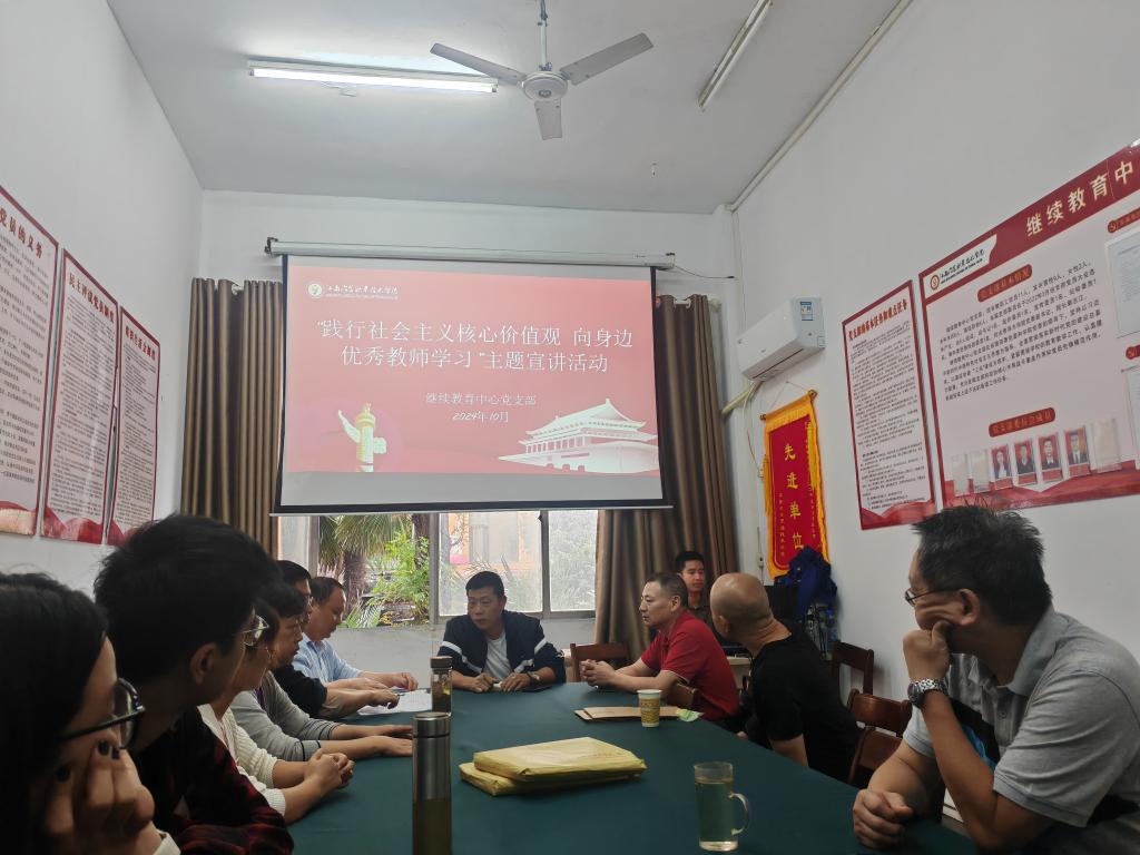 10月15日下午,继续教育中心在明辨楼115党员活动室开展“践行社会主义核心价值观,向身边优秀教师学习”主题宣讲活动。活动由继续教育中心副主任郭永飞主持,张洋老师主讲,中心全体成员参与。