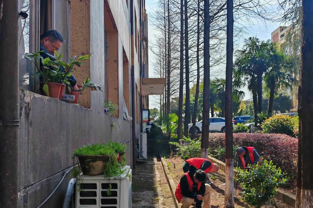 随后,在彭德胜与中心副主任郭永飞带领下,全体党员开展了志愿清扫活动。大家身着红色志愿者服饰,热情高涨,手持扫帚、拖斗、垃圾钳等清洁工具,认真清理了校园树木之间的纸巾、塑料瓶、落叶、烟头等垃圾。