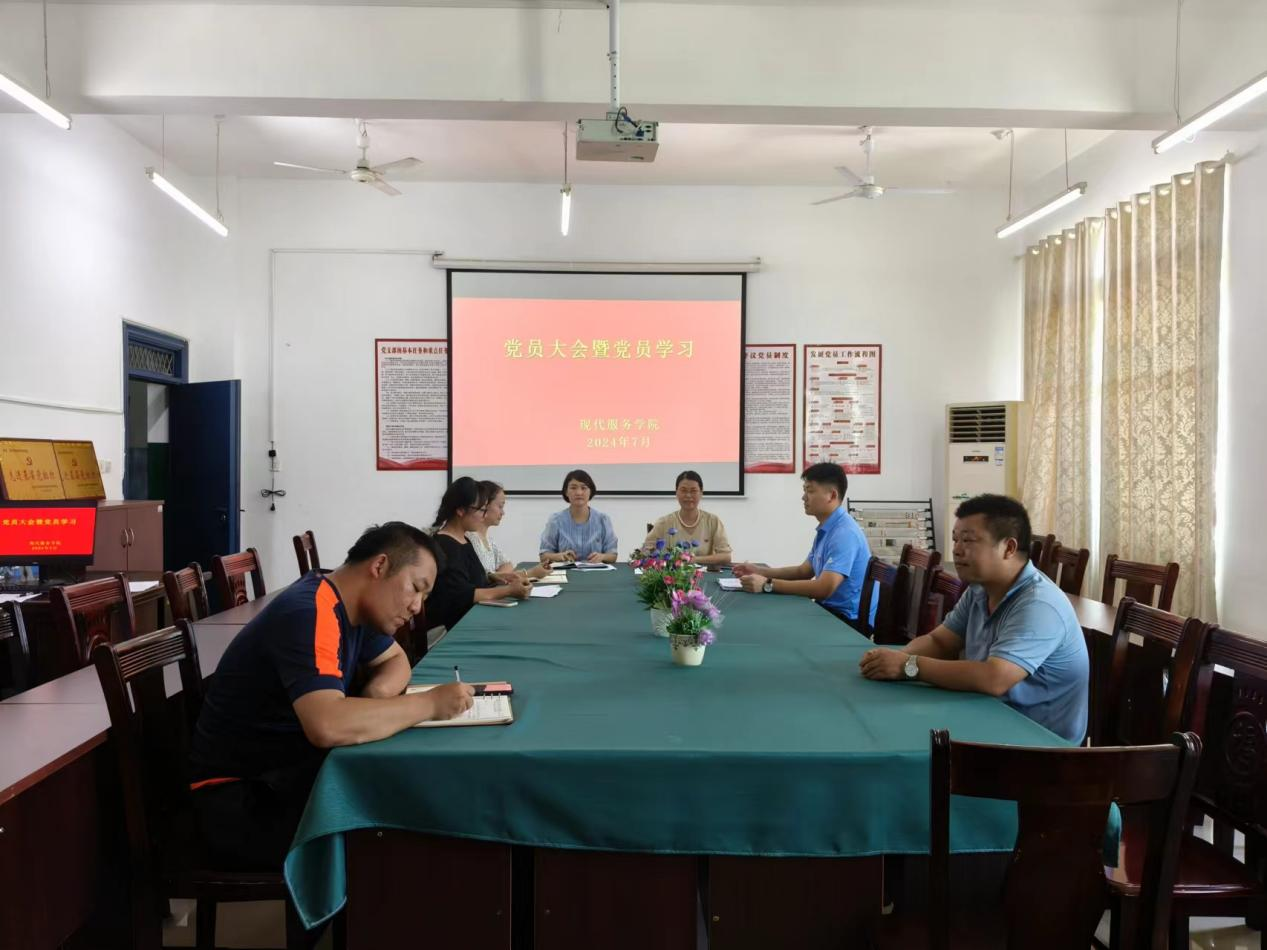 【现代服务学院周明霞报道】2024年7月23日,现代服务学院在自强楼党员活动室开展了一场旨在深入学习贯彻党的二十届三中全会精神的党员学习活动。此次活动线上线下相结合,由党支部书记欧阳小缨主持。副院长江敏、胡小平、郭鹏及全体党员参加。