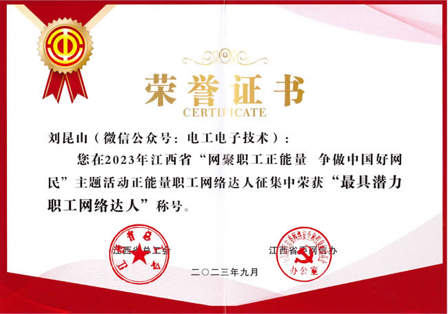 2023年9月,刘昆山老师创作的微信公众号《电工电子技术》被评为最具潜力职工网络达人荣誉称号。2023年7月,由江西省总工会、江西省委网信办主办,江西工人报社承办的江西省“网聚职工正能量 争做中国好网民”主题活动进行了“赣出精彩 e路有你”正能量职工网络达人征集评选活动。该活动经过“网上征集、线上投票和线下组织专家集中评选”,评出网络达人,并予以了表彰。《电工电子技术》微信公众号是刘昆山老师2015年7月1日创立...