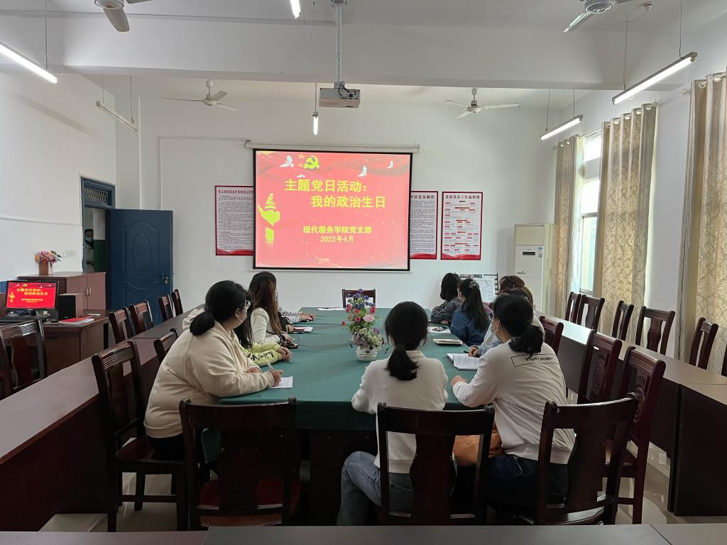 【现代服务学院廖斐报道】4月6日,在三教党员活动室,现代服务学院党支部举行了“我的政治生日”主题党日活动。活动由党务干事廖斐主持,全体党员参加。首先,会议学习了学院党委书记杨乐文在学院全面从严治党会议上做的《坚定不移推进全面从严治党向纵深发展 以优异成绩迎接党的二十大胜利召开》报告、学院纪委书记谢向莹做的《坚定不移推进全面从严治党 以实际行动迎接党的二十大胜利召开》报告。随后,党支部给当天过“政治...