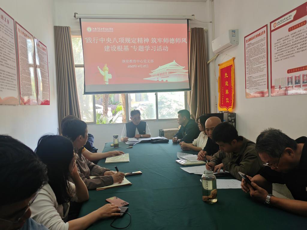 4月15日下午,在明辨楼115党员活动室,继续教育中心党支部召开“践行中央八项规定精神 筑牢师德师风建设根基”专题学习会。会议由党支部书记彭德胜主持,中心全体教职工参加。 会议集中学习了有关文件精神,并结合《高校违反师德师风典型案例》开展了警示教育。 彭德胜讲话。他要求,全体教职工要切实提高政治站位,深刻领会中央八项规定精神实质,以典型案例为镜鉴,筑牢思想防线;要把学习成效转化为改进工作作风、推动事...