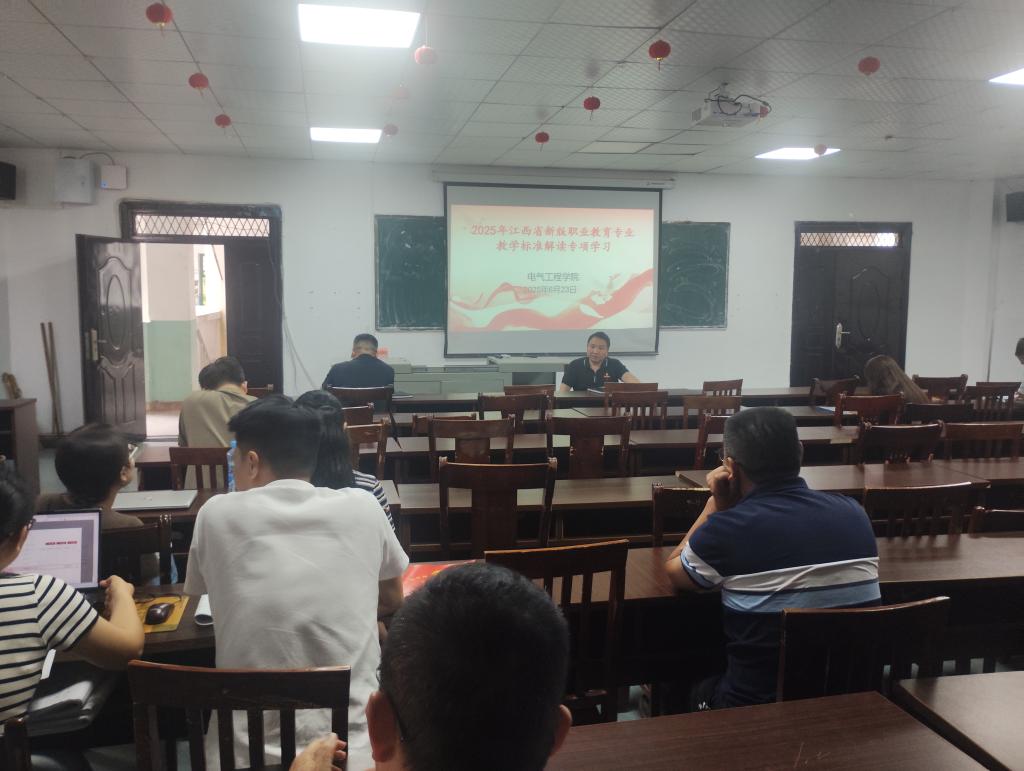 为贯彻落实教育部职业教育发展新要求,精准锚定专业建设方向,2025 年 6 月 23 日,电气工程学院于四教 312 活动室召开江西省新版职业教育专业教学标准专题学习会。学院全体教师、教研室主任及教学管理人员参会,会议由黄锦文院长主持并作重要指示。会上,黄锦文院长率先传达教育部职业教育发展中心关于新版专业教学标准实施的核心精神,强调新标准是规范专业建设、提升人才培养质量的纲领性文件,要求全体教师深刻领会其战略意...