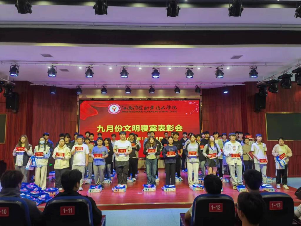 2023年10月25日上午,我校在图书馆报告大厅召开文明宿舍表彰大会。158个宿舍收到表彰。根据学校文明宿舍创建方案,经过班级申报、分院推荐、学工核查,学校决定授予文明宿舍158个,其中25个5星级宿舍,56个四星宿舍,77个三星宿舍,予以表彰奖励。会议对五星宿舍、四星宿舍、三星宿舍寝室长进行颁奖,授予相应星级宿舍奖牌和奖品。受表彰人员最后合影留念