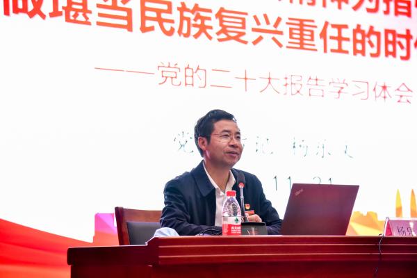 11月22日下午,beat365英国官方网站报告大厅掌声阵阵、气氛热烈,学校党委书记杨乐文向挂点党支部的全体教职工宣讲党的二十大精神,来自制造工程学院、现代服务学院和思想政治理论课教学部党支部的130余名同志到场聆听宣讲。杨乐文开宗明义,学习宣传贯彻党的二十大精神是当前和今后一个时期学校的首要政治任务,要在全面学习上下功夫,坚持读原文、悟原理,不断深化对新思想新论断、新部署新要求的学思践悟,推动党的二十大精...
