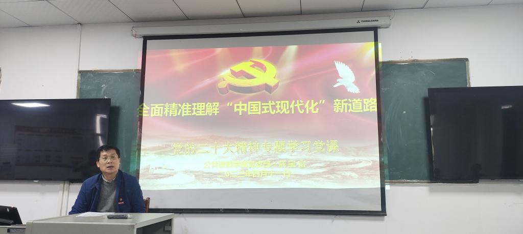【公共课教学部党支部雷小花报道】4月11日下午,公共课教学部党支部在明辨楼312室开展党课学习活动。公共课教学部部长戴宝富为大家上了一堂别开生面的党课。党课由党支部书记邓灵波主持,支部全体党员及入党积极分子参加。戴宝富从党的二十大报告中的“中心任务”和“两步走”重要论述出发,分享了自己的理解和体会,重点从三个方面的内容进行了讲述:一是中国式现代化的五个特征;二是中国式现代化的本质要求;三是中国式现代...