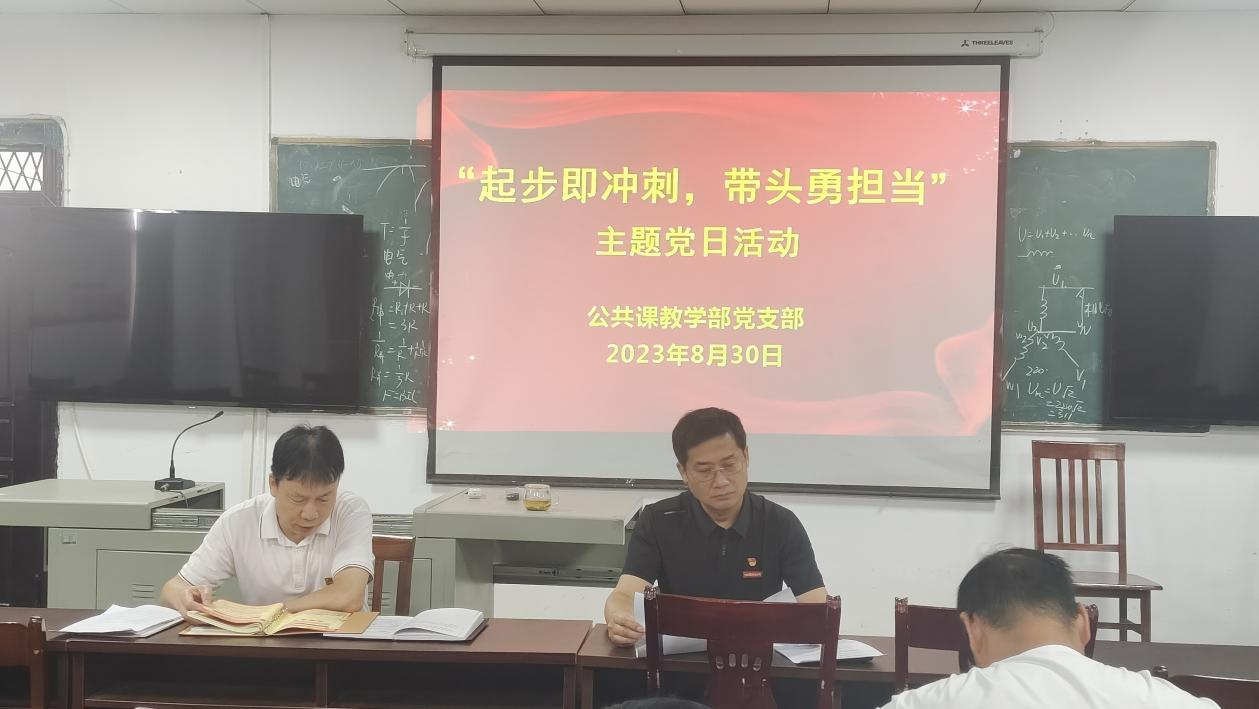 【公共课教学部党支部雷小花报道】按照学校主题教育实施方案的要求,8月30日上午,公共课教学部党支部在明辨楼312室开展“起步即冲刺,带头勇担当”的主题党日活动。活动由党支部书记邓灵波主持,支部全体党员参加学习。活动伊始,邓灵波带领全体党员面对党旗,重温入党誓词。随后,邓灵波带领大家学习了《中国共产党章程》、《习近平总书记关于教育和职业教育重要讲话和重要指示批示精神》;戴宝富领学了《习近平在四川考察时...