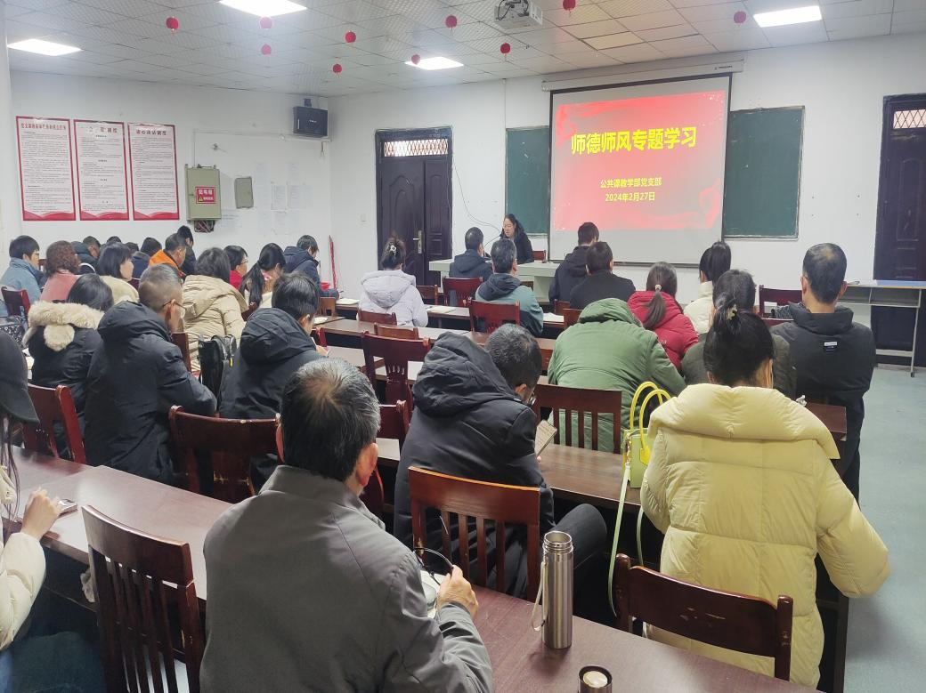 【公共课教学部杨晶报道】2月27日上午,公共课教学部在明辨楼312室召开新学期教职工大会,布置新学期工作,开展全员师德师风教育。会议由公共课教学部党支部书记陈耀新主持,全体教职工参加。 会上,陈耀新讲话。他提出要求,在新学期的教学中要继续保持拼搏的劲头,加强教学研究交流,教师队伍建设,进一步提高教育教学质量。 公共课教学部部长戴宝富讲话。他对部门2023年工作的亮点和不足进行了小结和反思,对如何干好2024...