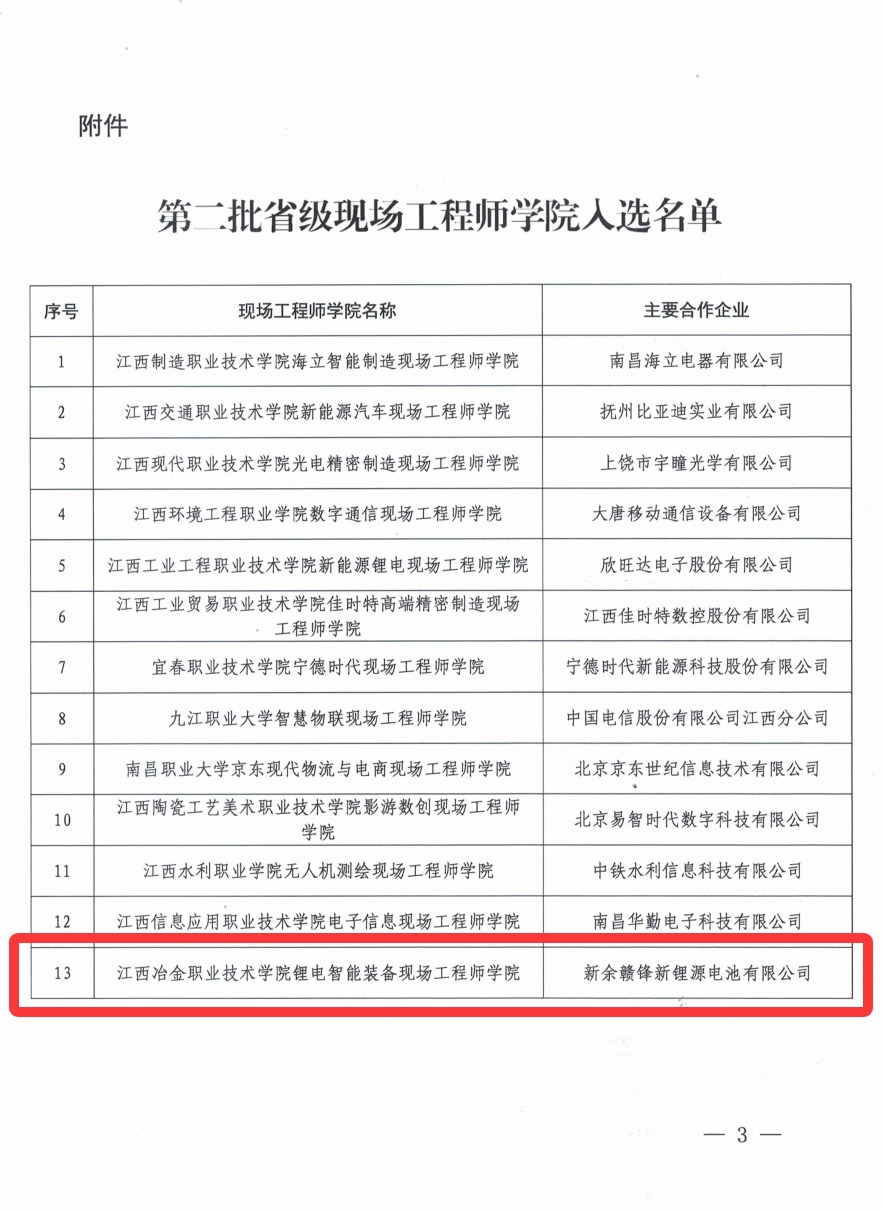11月22日,从江西省教育厅传来好消息,省厅与工信厅、省国资委、省发改委联合发文,公布了第二批省级现场工程师学院遴选结果,学校锂电智能装备现场工程师学院成功入选。该现场工程师学院,是我校与新余赣锋新锂源电池有限公司共同打造的特色育人平台。平台以“校企双主体”模式运行,学生“招生即招工、入校即入企、毕业即就业”。平台实行“双导师”协同育人机制,企业遴选技术骨干担任师傅,与学校教师共同制定个性化培养方...