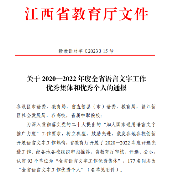 近日,江西省教育厅、江西省语言文字工作委员会印发了关于表彰全省语言文字工作优秀集体和优秀个人的通报。我校教务处处长何志昌同志荣获“全省语言文字工作优秀个人”荣誉称号。 何志昌在2020-2022年期间,充分结合学院各专业特色,组织开展了一系列国家通用语言文字推广活动和提升培训、“推普周”宣传教育、“游园会”等活动。这些语言文字推广活动不仅内容丰富、形式多样,而且师生参与度、评价高,还涌现出了一大批语言...