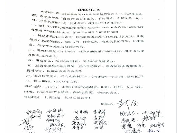 在第30届“世界水日”和第35届“中国水周”来临之际,思政部开展“节水中国 你我同行”节约用水宣传倡议活动。2022年3月28日,思政部全体成员集中学习了活动内容,然后进行签名承诺,积极宣传节水、爱水、亲水、护水和水生态文明建设等常识,引导教师改进用水方式,提高水的利用率,避免水资源的浪费。教职工们均表示,爱护水资源就是爱护人类自己,我们不仅应当积极倡议,更应当落实,节约用水,从自己做起,从身边的一点一滴做起