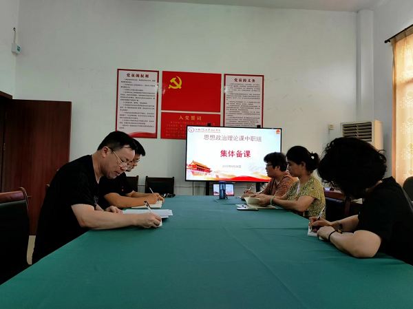 2022年8月30日,思政部中职教研室全体教师在思政部党员活动室进行了本学期第一次集体备课。 会议由教研室主任朱秋明老师主持。一是讨论制定《2022-2023学年第一学期中职课教研室工作计划》,二是对本学期《经济与政治常识》《职业生涯规划》两门课授课计划进行安排。集体备课中,就如何将红色文化、技能成就梦想等内容融入教学进行讨论交流。大家表示,要充分挖掘素材,利用思政课在所任班级学生中讲好红色故事,传承红色基因...