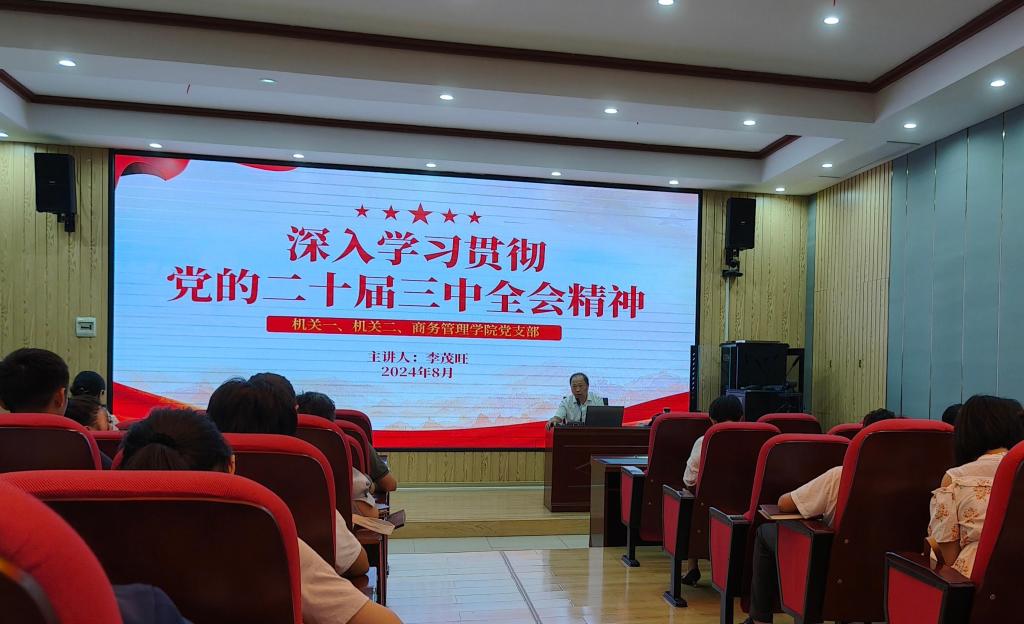 2024年8月27日下午,校党委副书记李茂旺给机关二支部全体党员在思政大讲堂上了一堂党课,题为“深入学习贯彻党的二十届三中全会精神”,为支部党员宣讲党的二十届三中全会精神。 李茂旺从六个方面对党的二十届三中全会精神进行解读,即党的二十届三中全会概况、深刻领会和把握党的二十届三中全会的重大意义、深刻领会和把握中央政治局工作报告的主要精神、深刻领会和把握《中共中央关于进一步全面深化改革、推进中国式现代化...
