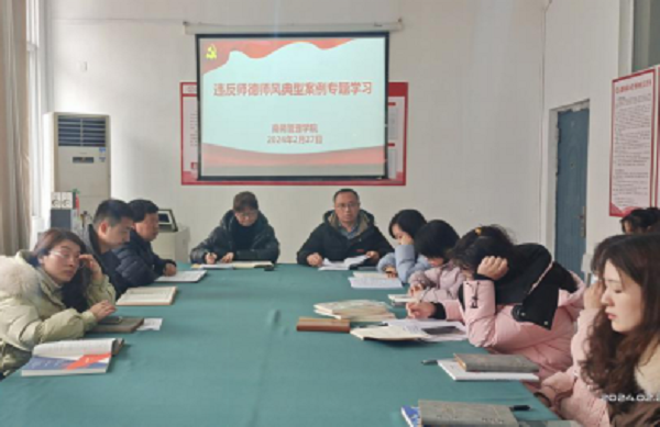 2024年2月27日上午,商务管理学院在南校区三教208党员活动室召开违反师德师风典型案例专题学习会。分院院长郭斌,副院长陈利华、江小美,综合干事阮星星以及全体教师参加了本次专题学习。会议由陈利华主持。 会上,陈利华带领全体教师共同学习了《违反师德师风典型案例汇编》。案例警示全体教师,要知敬畏、守底线、明师德、筑防线。陈利华要求全体教师,要引以为戒,警钟长鸣,认真履行教师职责,恪守职业道德。 最后,郭...