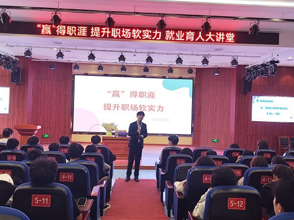 近日,商务管理学院在学术报告大厅举办了“企业家进校园”—职业生涯规划专题讲座。杭州金膳祥生物科技有限公司行政副总叶耀受邀来校进行授课。分院院长郭斌、副院长陈利华出席,相关辅导员及各班学生代表参加。 讲座以《“赢”得职涯,提升职场软实力》为主题,从危机意识、心智管理、目标管理、沟通管理、价值管理五个方面讲授。叶耀指出,身为大学生,需具备习惯意识与安全意识。习惯意识就是人要有良好的习惯,拥有好习...