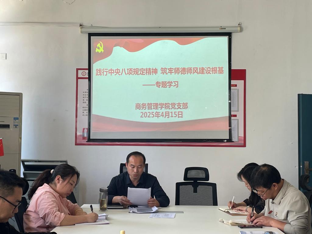2025年4月15日,在南校区第三教学楼208室,商务管理学院党支部开展了以“践行中央八项规定精神,筑牢师德师风建设根基”为主题的专题学习。分院党支部书记唐毓林主持,全体教职工参加。 会上,集中学习了有关文件。按照“把自己摆进去、把工作摆进去、把职责摆进去”原则,会议进行了热烈讨论。大家踊跃发言,交流学习体会。易珍琴老师表示,作为一名辅导员,平时要多走进寝室,像爱护自己的孩子一样,关心爱护学生,力所能...