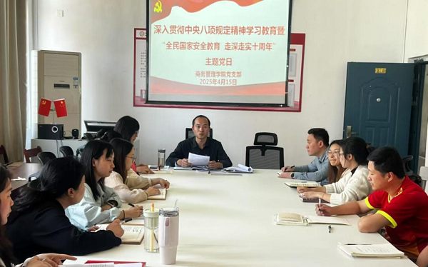 2025年4月15日下午,在南校区第三教学楼208党员活动室,商务管理学院党支部开展了“全民国家安全教育 走深走实十周年”主题党日活动。活动由党支部书记唐毓林主持,全体党员参加。 活动集中学习了关于总体国家安全观的有关文件。与会人员围绕主题进行了交流研讨。大家纷纷表示,要严格对标中央八项规定精神,时刻保持清醒的头脑,严守党纪国法,坚决不触碰红线。要在日常工作中自觉践行总体国家安全观,提高安全防范意识,严...