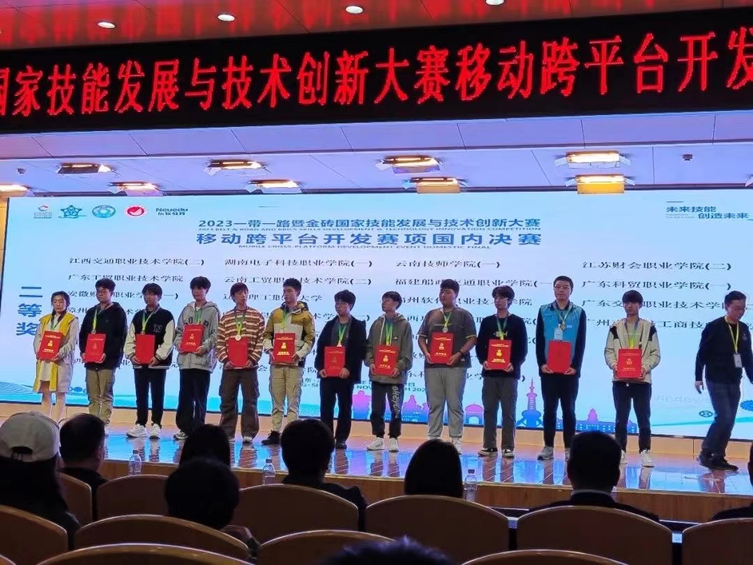 11月4日-5日,智能工程学院师生参加2023一带一路暨金砖国家技能发展与技术创新大赛“移动跨平台开发”赛项,在国内总决赛中获两项二等奖。 赛项由金砖国家工商理事会、一带一路暨金砖国家技能发展国际联盟、中国科协一带一路暨金砖国家技能发展与技术创新培训中心主办,共有来自全国74所高职院校的124支参赛队伍同台竞技。分院21级软件技术专业的蓝善繁、曹阳鹏两位同学荣获个人赛二等奖。指导老师为李佳铭。 “移动跨平台...