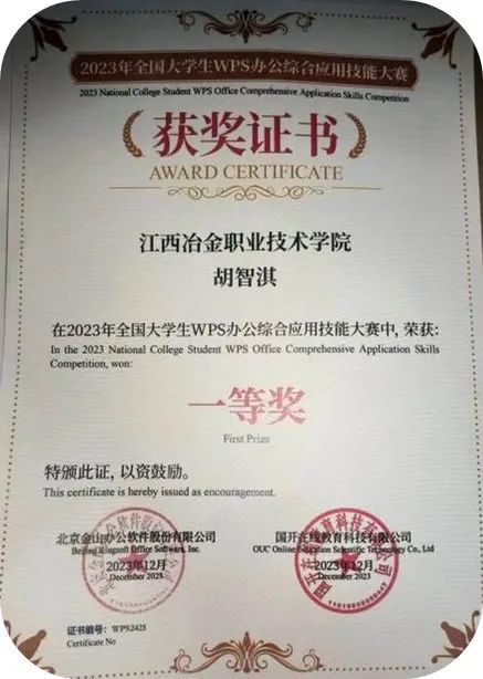 01-08/2024智能工程学院学生在全国大学生WPS办公综合应用技能大赛上荣获一等奖