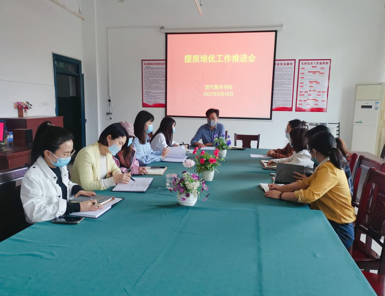 【现代服务学院肖倩芸报道】2022年5月18日,在老三教党员活动室,现代服务学院召开提质培优工作推进会,分院院长阮和平主持会议。会上,各项目负责人汇报了各自承接的提质培优工作开展情况,梳理了工作思路、当前进展、后续安排、存在问题等。同时,就下一步工作开展进行了讨论交流,建言献策。最后,阮和平对提质培优工作提了三点要求:一是要高度重视,充分认识到提质培优工作的重要性;二是要精雕细琢,保证提质培优工作的质...