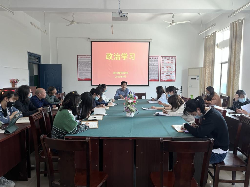 【现代服务学院廖斐报道】5月24日下午,现代服务学院在老三教党员活动室开展教职工集中政治学习,会议由党支部书记欧阳小缨主持。 会上,龙思婕老师带领大家学习《习近平总书记教育重要论述讲义》以及《习近平法治思想学习纲要》。随后,张淼老师带领大家学习学院党委书记杨乐文《学院第三届教职工代表大会暨第三届工会会员代表大会上的讲话》,杨乐文书记在讲话中首先对新当选的同志们表示热烈祝贺,也在接下来的工作中对大家...