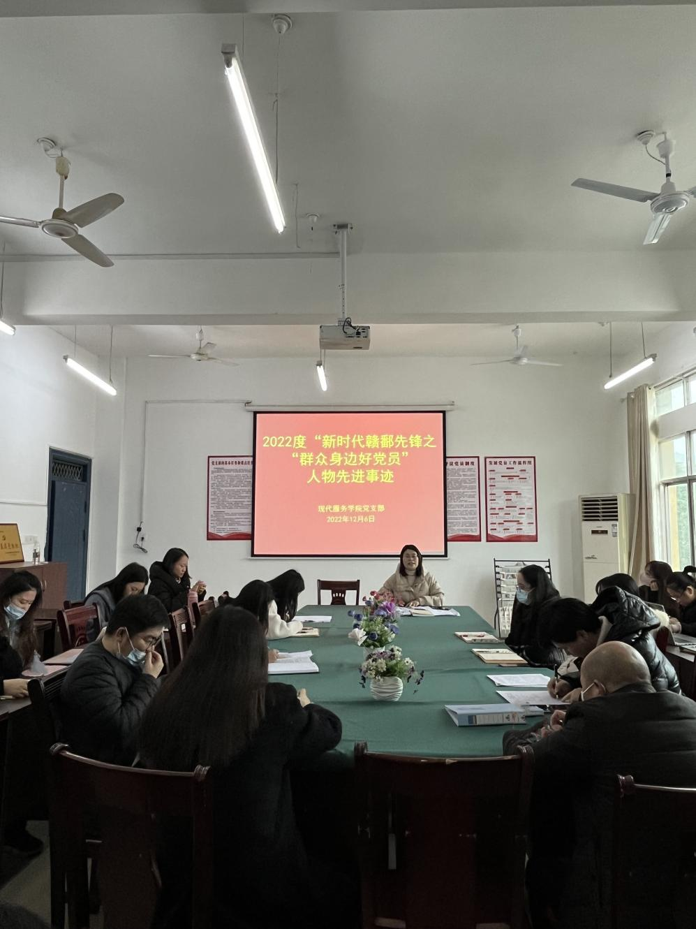 【现代服务学院廖斐报道】2022年12月6日,现代服务学院党支部在三教党员活动室开展学习2022年度“新时代赣鄱先锋,群众身边好党员”人物先进事迹活动。本次活动由党支部书记欧阳小缨主持,全体党员参加。会上,廖斐老师组织全体党员学习2022年度“新时代赣鄱先锋,群众身边好党员”中五位优秀党员人物先进事迹。他们分别是铁心向党,坚决把对党忠诚植入灵魂的黄智德,忠诚勇毅、严于律己的熊磊,坚持人民至上、生命至上的王欣,...