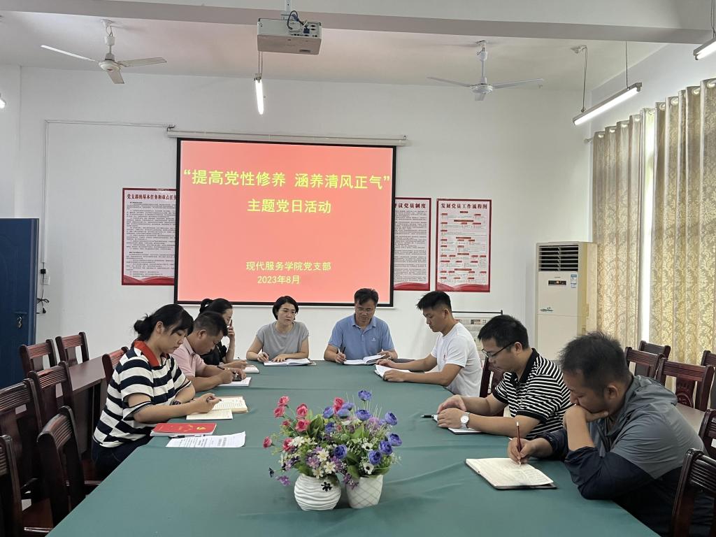 【现代服务学院廖斐报道】8月14日,现代服务学院党支部在党员活动室开展了以“提高党性修养 涵养清风正气”为题的主题党日活动。本次主题党日活动由组织委员廖斐主持,全体党员教师参加。会议伊始,全体党员面对党旗重温入党誓词。会议学习了有关文件精神。会议强调,要深入学习贯彻习近平总书记重要讲话精神,深刻领悟“以学正风”的丰富内涵,把学习成果转化为工作动力和成效,助力教育事业高质量发展。会上,党员代表就学习...