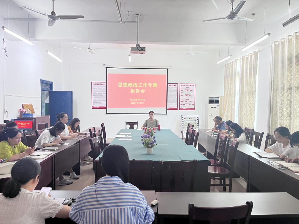 【现代服务学院文维报道】9月19日下午,现代服务学院在北校区三教党员活动室召开教职工思想政治工作专题会,总结工作,布置任务。会议由分院党支部书记欧阳小缨主持,全体教职工参加。会议围绕两个内容展开。首先,傅芳芳老师领学了习近平总书记给东北大学全体师生的回信。陈珑琪老师领学了职业院校教学数字化工作的相关政策。数字化是职业教育现代化的必然要求,其本质是以数字技术为媒介,拓展职业教育改革发展的广阔空间,重...
