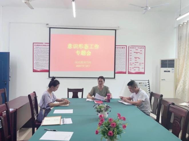 【现代服务学院文维报道】9月19日下午,现代服务学院召开意识形态工作专题会,学习贯彻有关精神,安排布置具体工作。会议由分院党支部书记欧阳小缨主持,全体教职工参加。会上,欧阳小缨领学了教育部、国家民委、共青团中央召开的学校铸牢中华民族共同体意识教育工作推进会精神。文维老师领学了《中华人民共和国民族区域自治法》。袁思雅老师领学了习近平总书记关于网络安全和信息化工作的重要指示精神。欧阳小缨讲话。她要求,...