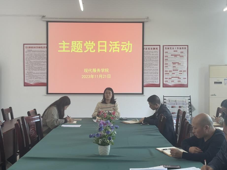 【现代服务学院廖斐报道】2023年11月21日,在北校区三教党员活动室,现代服务学院党支部开展“学党章、守党规、强党性、建新功”主题党日活动。活动由党支部书记欧阳小缨主持,全体党员参加。 活动中,欧阳小缨以问题为导向,围绕党章学习,发表了讲话。 全体党员围绕学习内容开展了交流讨论
