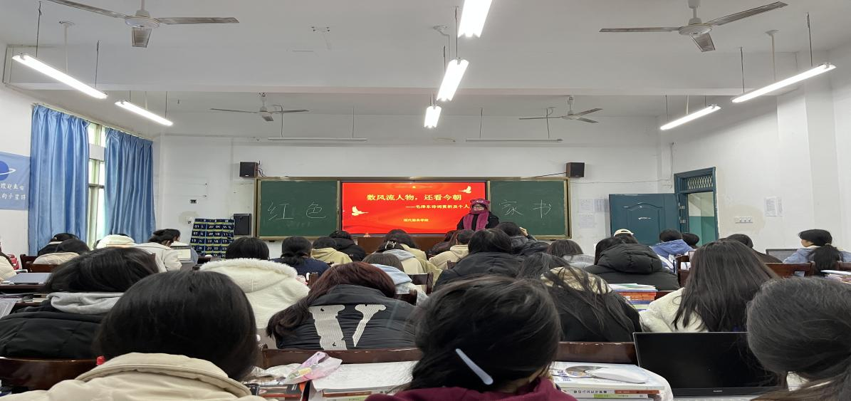 【现代服务学院徐卉报道】为纪念毛泽东同志诞辰130周年,品读红色经典,传承红色基因,汲取奋进力量,12月10日,现代服务学院青马班开展毛泽东诗词鉴赏分享活动。 课上,刘飞燕带领成员们赏析了毛泽东不同年龄的诗词作品,分析了毛泽东在各个时期的经历、志向和思想变化,还通过“飞花令”、分组诵读等方式,让学员们真切体会毛泽东诗词的韵味。同学们认真聆听,现场气氛良好。 活动最后,徐卉对本次活动进行总结,她指出“诗...