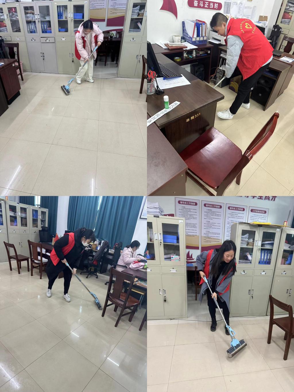 【现代服务学院徐卉报道】1月17日,现代服务学院组织全体老师对教学楼进行全面清扫,辞旧迎新,给广大学生营造一个安全、整洁、舒适、优美的学习和生活环境。 清扫前,分院副院长江敏进行了详细的分工,并提出了具体要求。全体教师积极响应。大家纷纷撸起袖子,拿起抹布,提起扫把,投入到卫生清扫行动中。老师们干得热火朝天,把教室、办公室、楼道、花圃周边都清理得干干净净。 大扫除虽然是一件日常生活中的小事,但全体教...