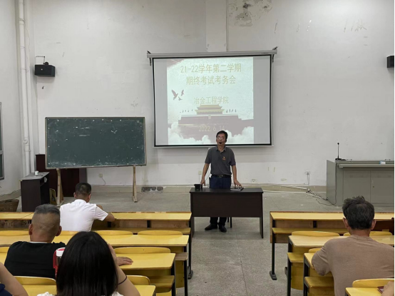 2022年6月14日下午,冶金工程学院在新一教阶梯教室召开本学期期末考试考务会,全体教职工参加。会议由冶金工程学院副院长曾伟勇主持。 曾伟勇对期末考试的各项工作做了具体的安排和部署。他强调,辅导员要督促学生布置好考场,考场内不能留有书籍和纸片;监考老师一定要遵守监考纪律,按时到达指定考场,及时督促学生上交手机,并且认真监考,不做与监考无关的事情;在考试结束后,阅卷老师认真批改试卷,在规定时间内按质...
