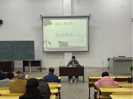 2022年3月22日下午,在新一教阶梯教室,冶金工程学院召开政治学习会议。会议由分院党支部副书记、副院长万美茜主持,分院副院长曾伟勇出席,教职工参加。 会上,万美茜领学了《赶考永远在路上——西柏坡精神评述》、《走好“新的赶考路”》两篇文章。她谈到,我们要读懂中国共产党人接续奋斗的精神密码,汲取百年党史中形成的优良传统和精神力量,激发新时代奋斗前行的内生动力。 万美茜要求,我们要永远保持清醒的头...